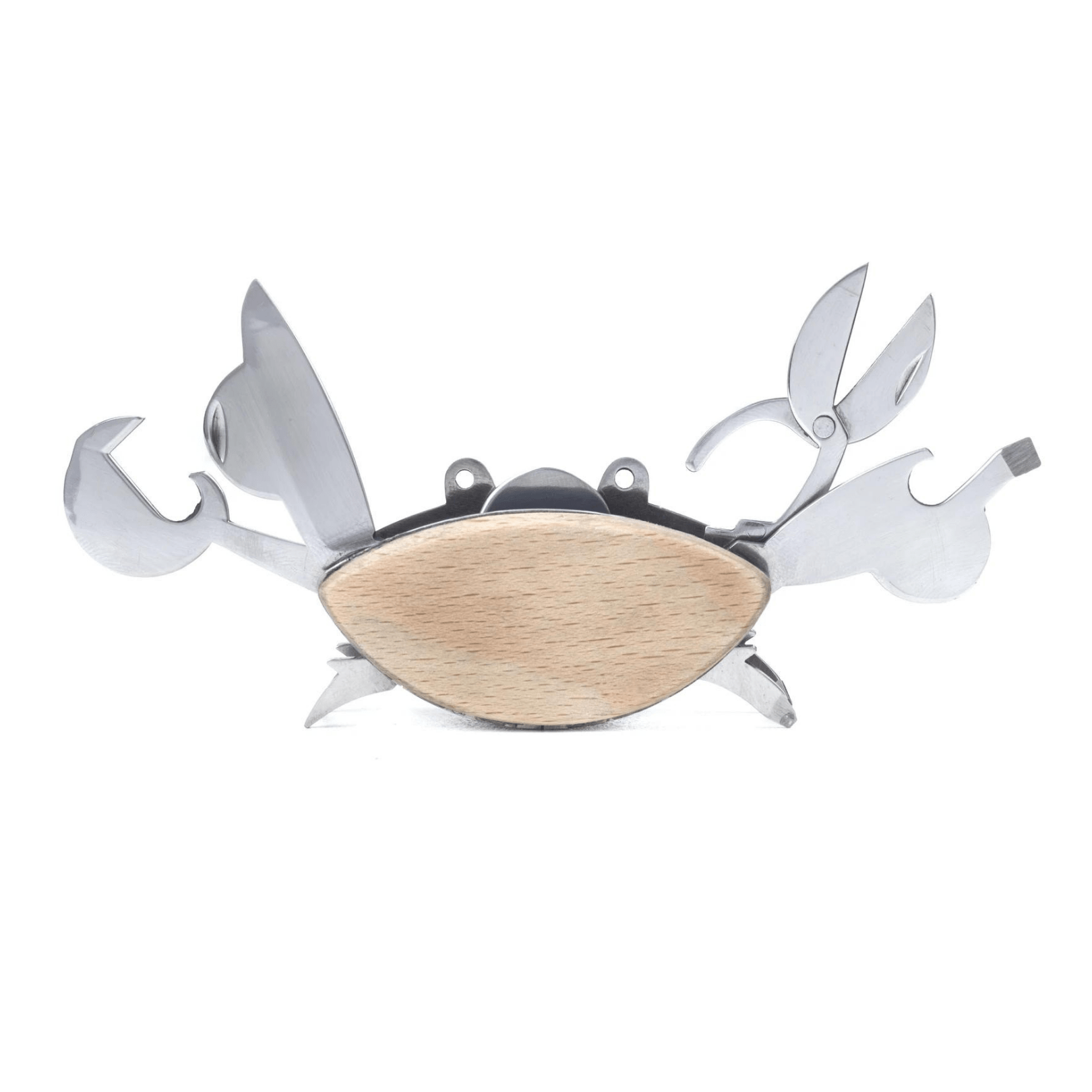 At the beach or on the go, this crab just wants to lend a helping claw. Grip his sturdy beechwood shell to utilize any one of his helpful stainless steel appendages. Comes with a mini scissor, bottle opener, 3/16 flat head screwdriver, can opener, mini knife, and rope saw.