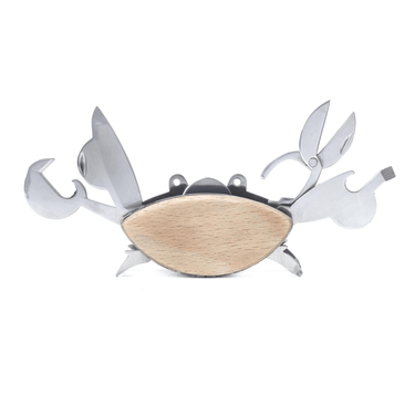 Crab Multitool is a creative crustacean tool for your kitchen, car, or toolbox. With five separate tools, there's not much this Crab Multitool can't do. Keep it anywhere, it's a fun and functional gift for any handyman or crab-loving cook. Kikkerland's Crab Multitool features a beautiful beechwood body and five stainless steel pull-out tools including scissors, bottle opener, can opener, rope saw, and flat head screwdriver.