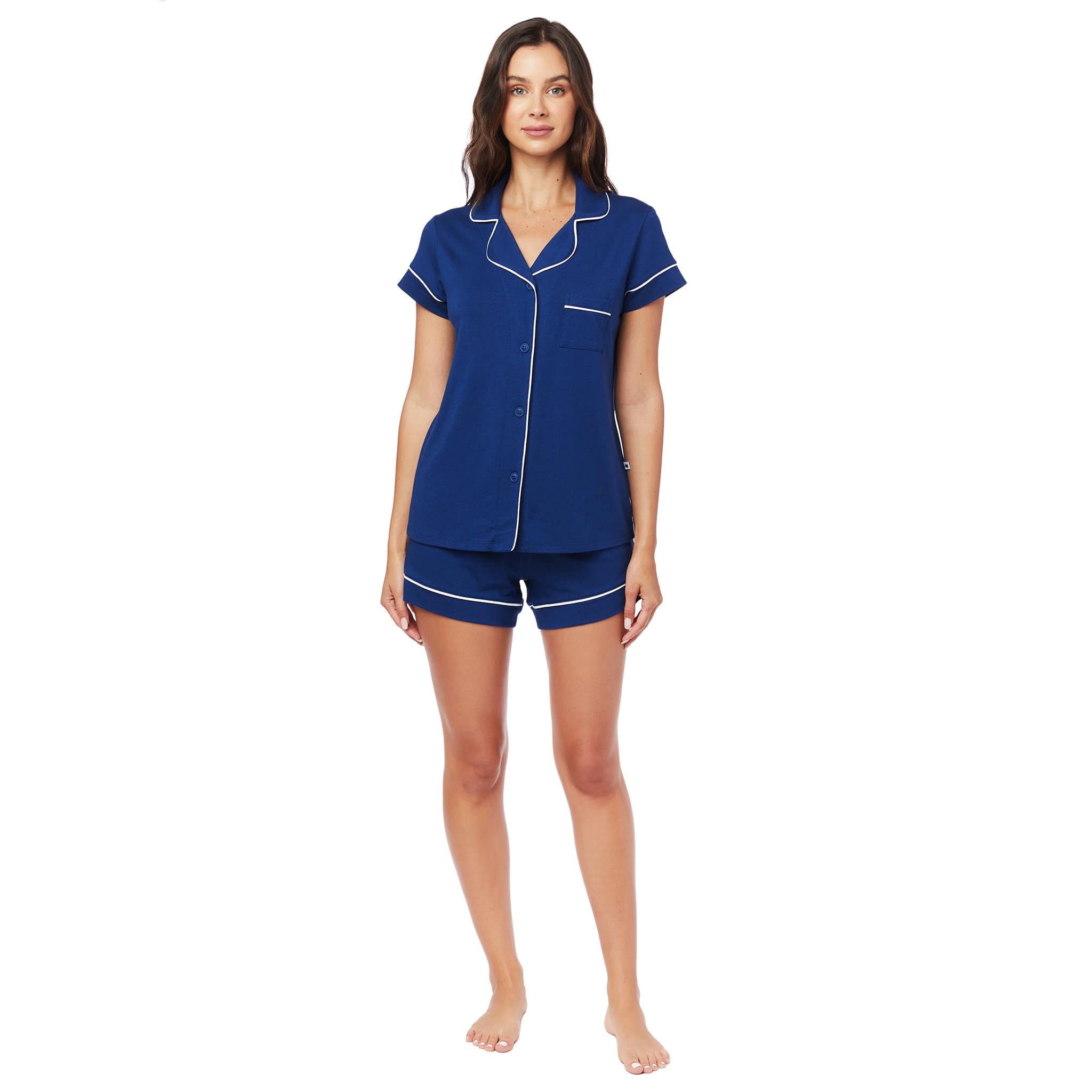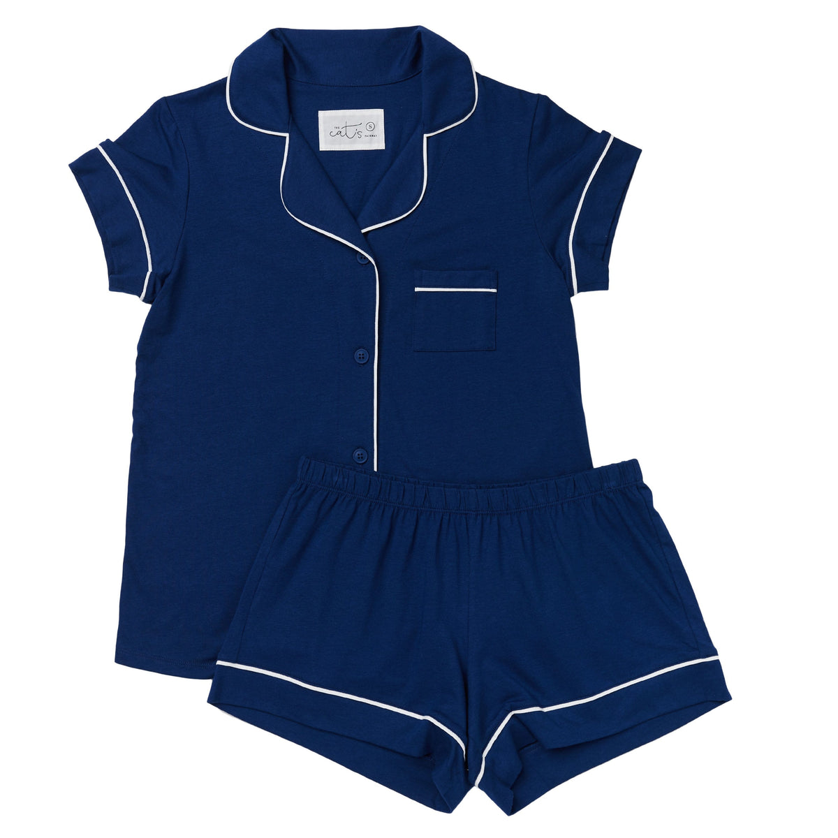 - Short-sleeved button-down pajama top with pocket and shorts