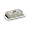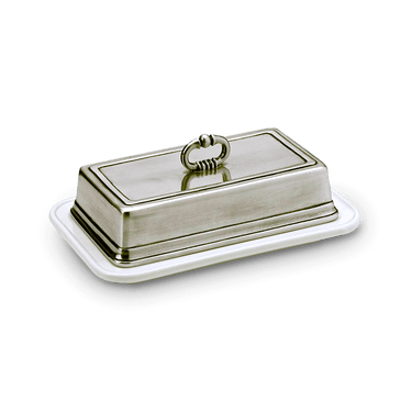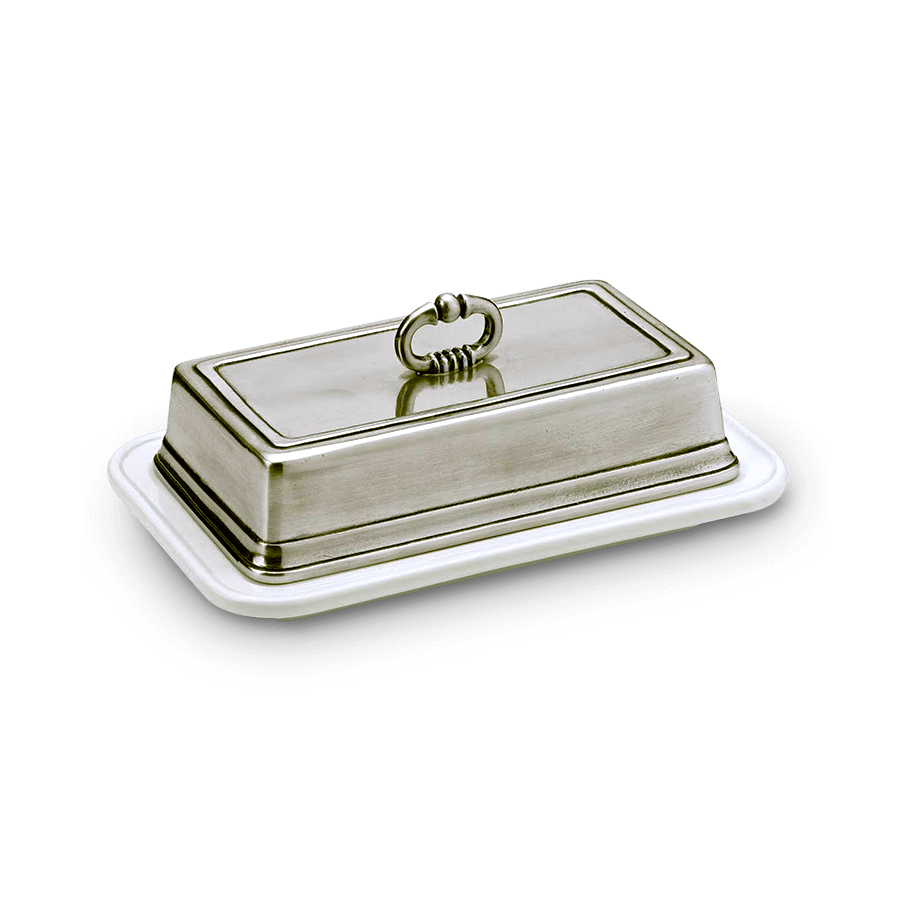 A classic butter dish features an elegant Italian pewter top with a ceramic base. An elegant addition that will shine with distinction on your dining room table or the kitchen counter.